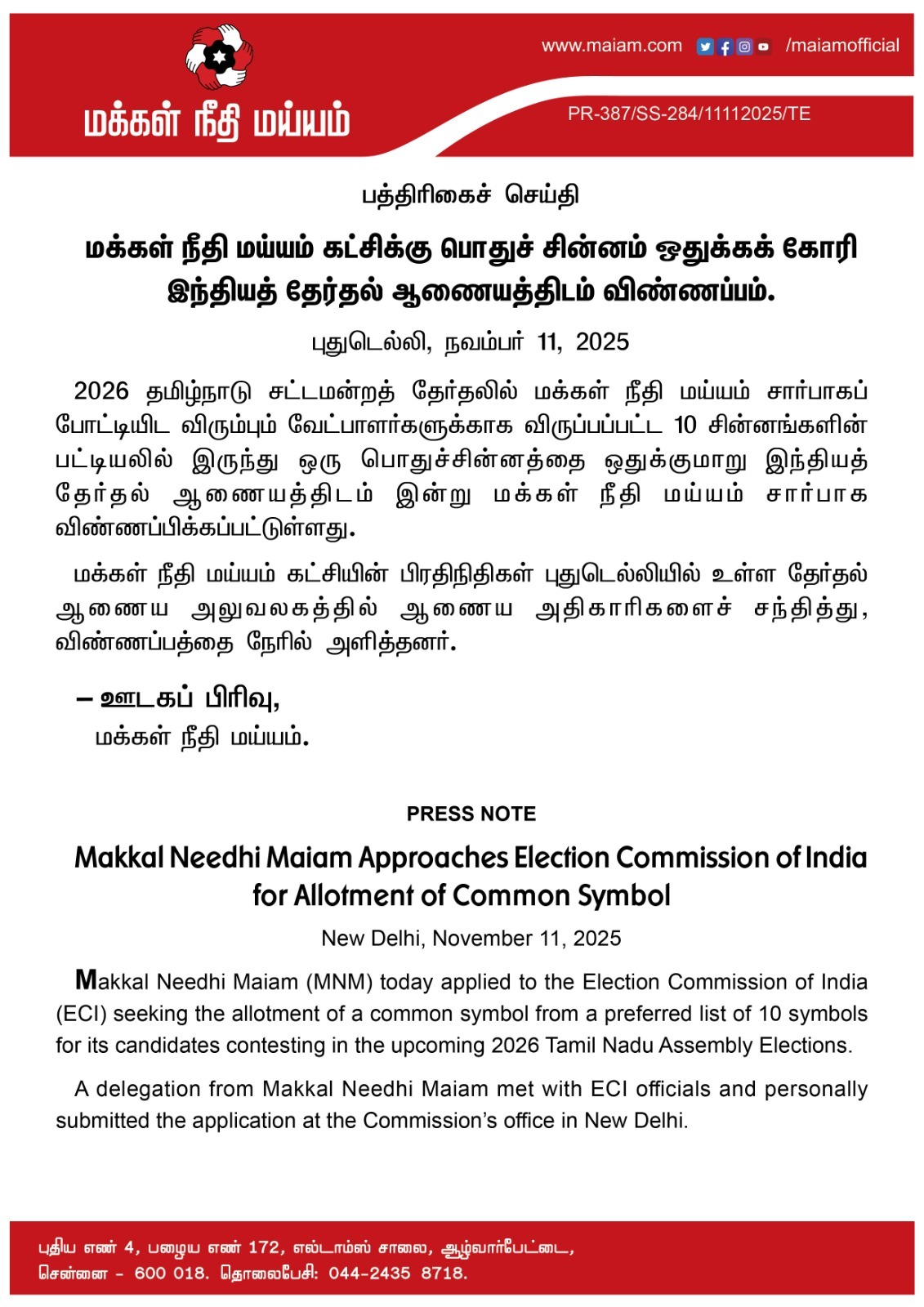 Makkal Needhi Maiam (MNM) today applied to the Election Commission of India (ECI) seeking the allotment of a common symbol from a preferred list of 10 symbols for its candidates contesting in the upcoming 2026 Tamil Nadu Assembly Elections.