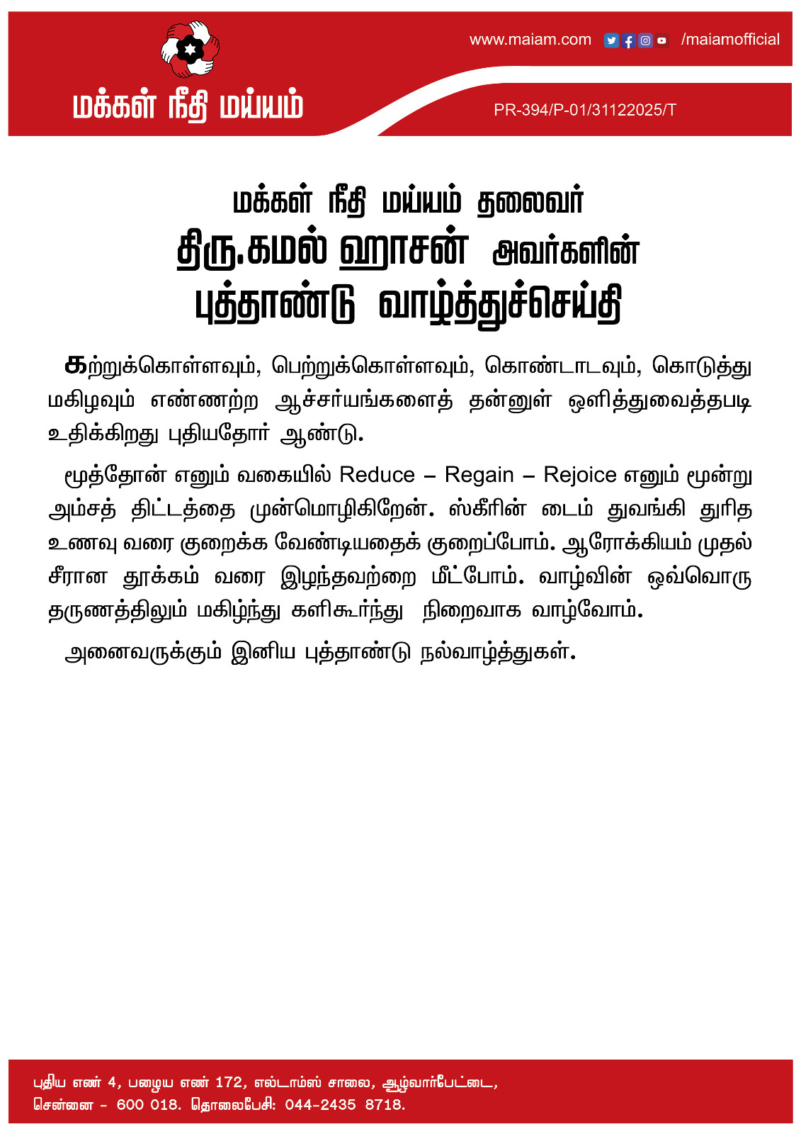 மக்கள் நீதி மய்யம் தலைவர் திரு.கமல் ஹாசன் அவர்களின் புத்தாண்டு வாழ்த்துச்செய்தி