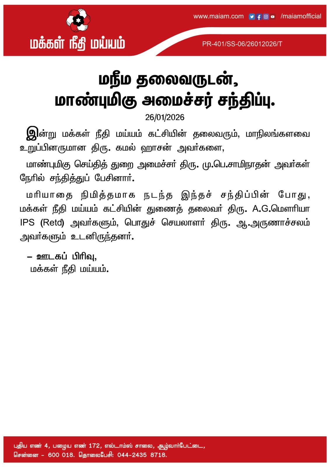 மரியாதை நிமித்தமாக நடந்த இந்தச் சந்திப்பின் போது, மக்கள் நீதி மய்யம் கட்சியின் துணைத் தலைவர் திரு. A.G.மௌரியா IPS (Retd) அவர்களும், பொதுச் செயலாளர் திரு. ஆ.அருணாச்சலம் அவர்களும் உடனிருந்தனர்.