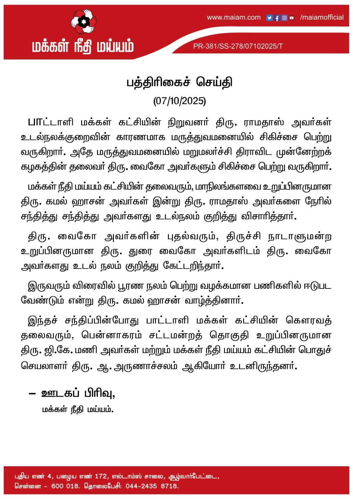 மருத்துவனையில் அனுமதிக்கப்பட்டுள்ள பாட்டளி மக்கள் கட்சியின் நிறுவனர் திரு. ராமதாஸ் அவர்களையும், மறுமலர்ச்சி திராவிட முன்னேற்றக கழகத்தின் தலைவர் திரு. வைகோ அவர்களையும் சந்தித்து நலம் விசாரித்தார், தலைவர் திரு. கமல் ஹாசன் அவர்கள்.