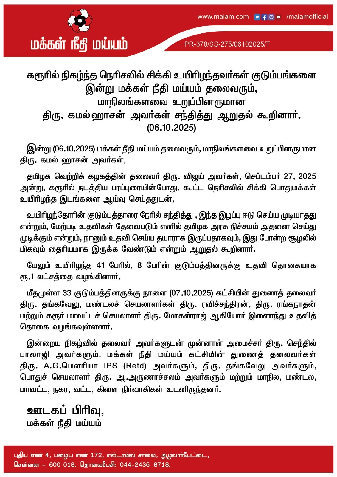 கரூரில் நிகழ்ந்த நெரிசலில் சிக்கி உயிரிழந்தவர்கள் குடும்பங்களைஇன்று மக்கள் நீதி மய்யம் தலைவரும், மாநிலங்களவை உறுப்பினருமானதிரு. கமல் ஹாசன் அவர்கள் சந்தித்து ஆறுதல் கூறினார்.